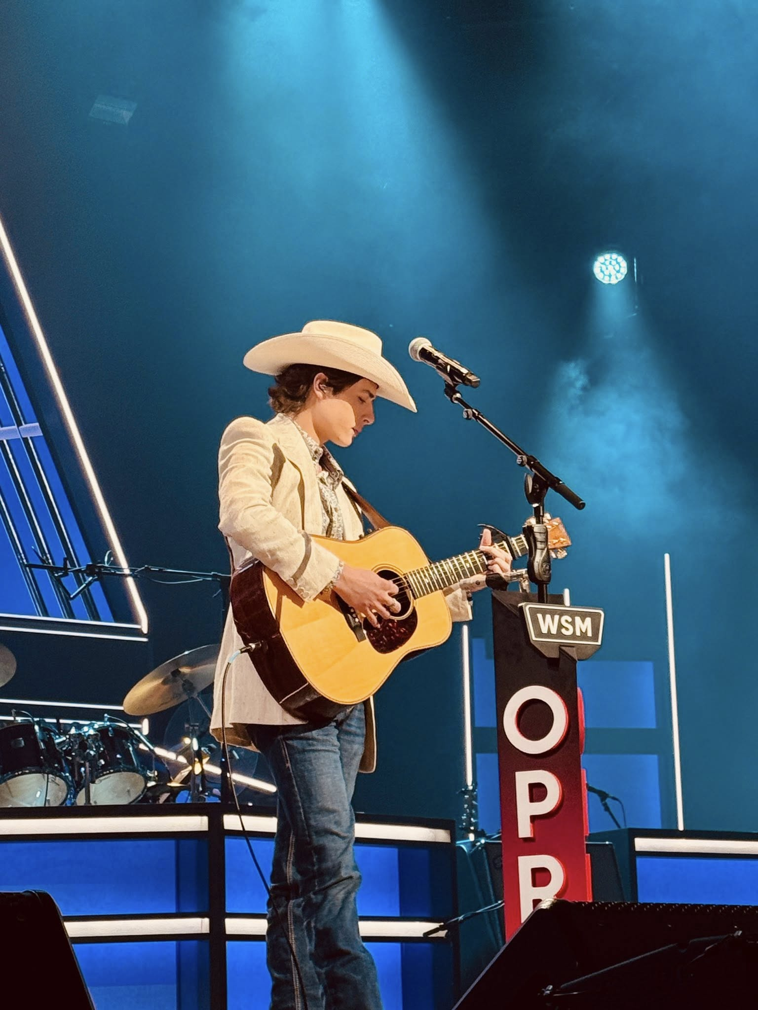 John took the stage at the Opry in front of a lively, excited crowd. He looked right at home on the iconic stage, wearing his classic cowboy hat, denim jeans and a white blazer.