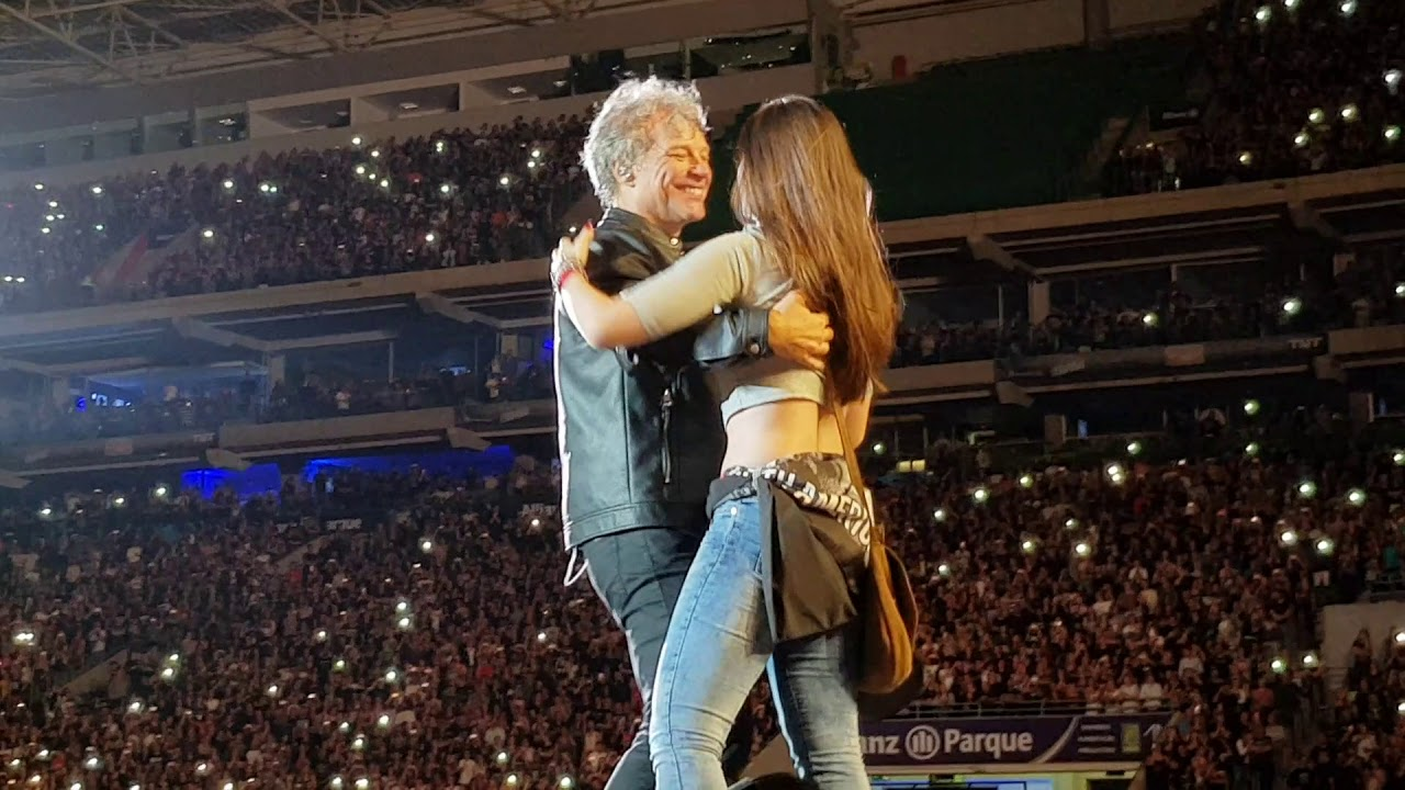 Jon Bon Jovi didn’t just perform “Bed of Roses” — he rewrote every fan’s fantasy in real time. In the middle of a roaring stadium in Brazil, as the first emotional chords echoed through the air, he spotted one stunned woman in the front row, pointed, smiled, and changed her life. With the ease of a rock legend and the charm of a ‘90s heartthrob, he invited her onstage — and in that instant, 50,000 people collectively forgot how to breathe.