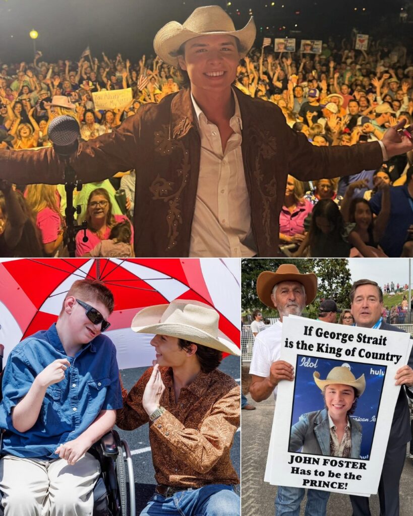 “‘That’s why I sing.’ — John Foster Chokes Up Onstage After Spotting a Little Cowboy With a Sign That Read: ‘John, You’re My Hero. I Voted!’” — They call him “The Prince of Country Music,” but last night, John Foster wasn’t a star — he was just a hometown boy saying thank you. Under a warm summer sky, families gathered, some in lawn chairs, some with tears already forming. Then came the moment: a young boy with Down syndrome, in a cowboy hat two sizes too big, holding a handmade sign that stopped John mid-song. He pointed, hand over heart, and said through tears: “That’s why I sing.” It wasn’t just a concert. It was a homecoming — and a reminder that the biggest stages sometimes sit right where you started.