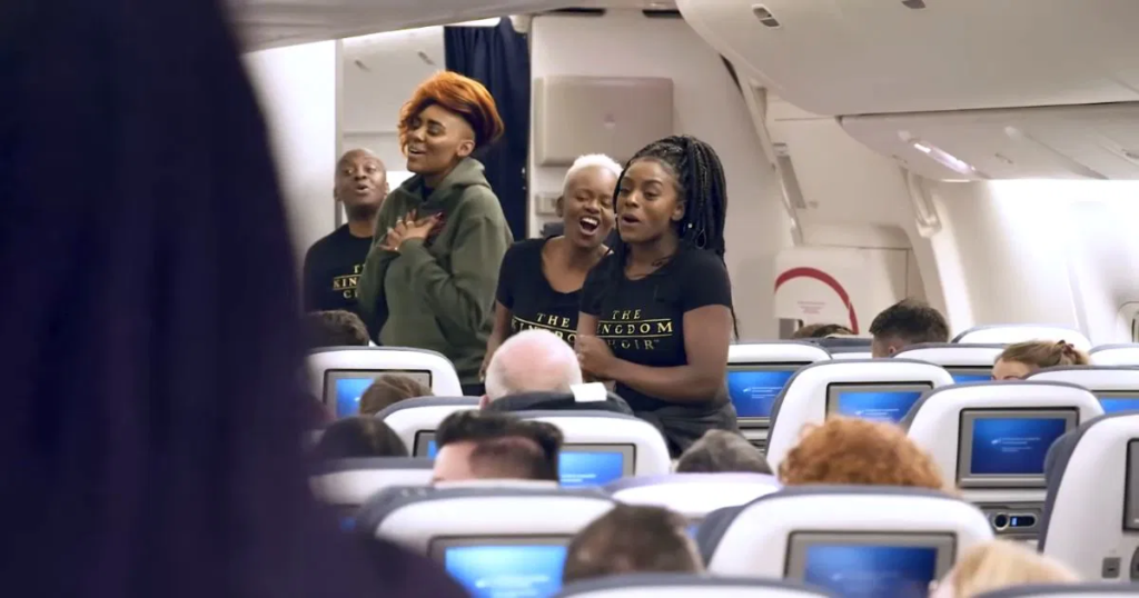 The Kingdom Choir didn’t just board a plane — they elevated it. One minute it was your average flight: crying babies, cramped knees, and the slow despair of midair boredom. The next, a hush swept through the cabin as a few passengers began to stand, not to reach for luggage, but to sing. Without instruments, without a stage, The Kingdom Choir launched into “Stand By Me,” and suddenly, that sterile metal tube at 35,000 feet transformed into something sacred.