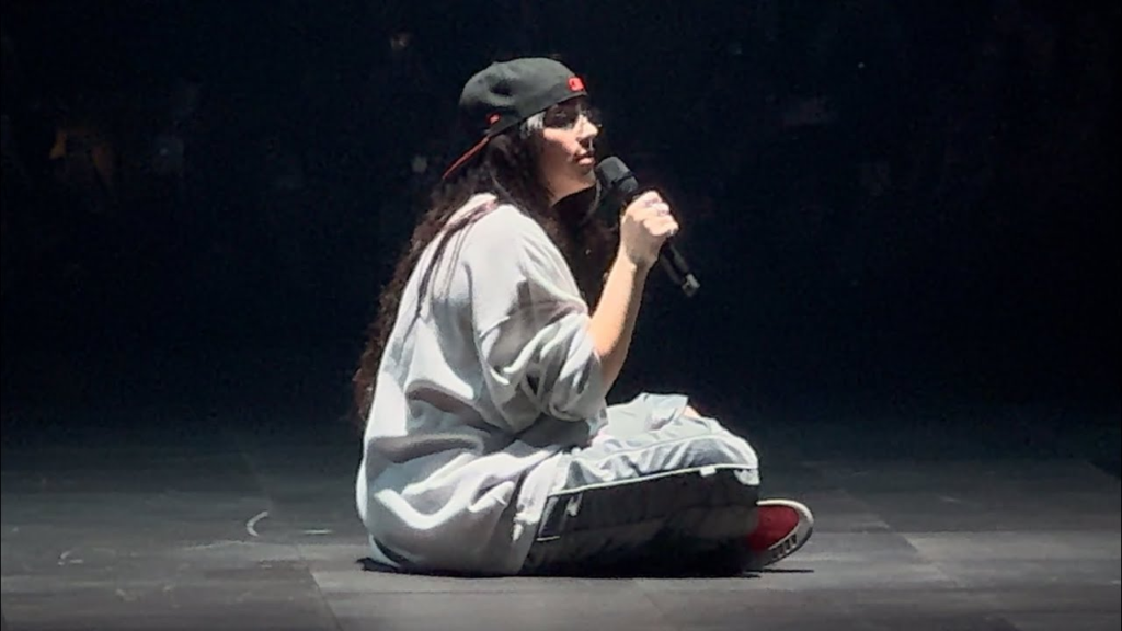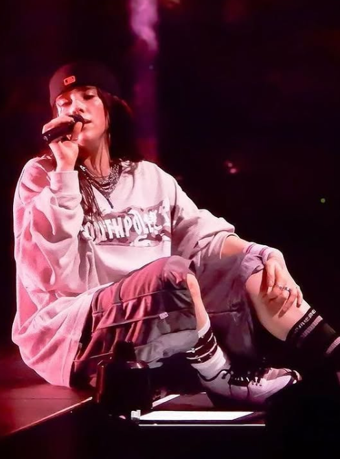 As the first note reverberated through the venue, there was an electric charge in the air. Thousands of fans, usually accustomed to the high-energy anthems and full-throttle performances, were suddenly caught in a tender hush, all eyes fixed on Billie. The crowd wasn’t cheering or clapping; they were simply holding their breath. Each fragile note she sang carried an immense weight, the kind that could only come from someone so in touch with their own vulnerability.